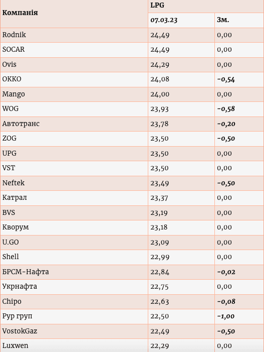 На автозаправних станціях утримується тенденція до здешевшання скрапленого газу: середня ціна на нього із 6 по 7 березня зменшилась ще на 0,20 грн/л – до 23,30 грн/л. Про це свідчать дані щоденного моніторингу роздрібного ринку Консалтингової групи «А-95», передає Enkorr.