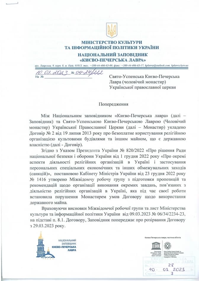 Згідно з повідомленням, заповідник попередив, що з 29 березня 2023 року договір буде розірвано на підставі висновків міжвідомчої робочої групи й листа Міністерства культури та інформполітики від 9 березня. УПЦ МП закликали до 29 березня звільнити державні приміщення, які вона орендує на території Нижньої Лаври на вулицях Лаврська, 11 та Лаврська, 15.