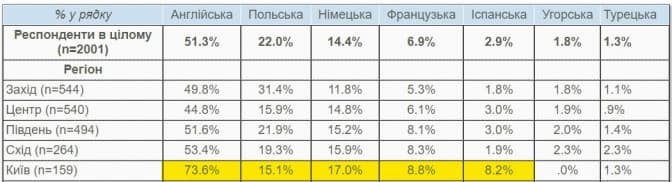За таких умов Київ є лідером серед регіонів країни за кількістю людей, які можуть пишатися знаннями англійської. У східних регіонах «знаю» можуть сказати 53,4% людей, на півдні 51,6%, в центральних регіонах – 44,8%, на заході – 49,8%.