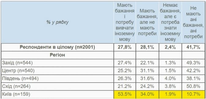 Оптимістичні показники мають жителі Києва і в рівні мотивації у вивченні іноземних мов. 53% опитаних повідомили, що мають бажання і потребу вчитися. Для порівняння, у західних та центральних регіонах про жагу до вивчення заявили трохи більше як 20% опитаних.
