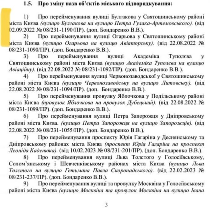 Нагадаємо, загалом міські депутати 23 березня перейменували 16 топонімів, зокрема площу Льва Толстого на площу Українських героїв, а також проспект Гагаріна на проспект Леоніда Каденюка.