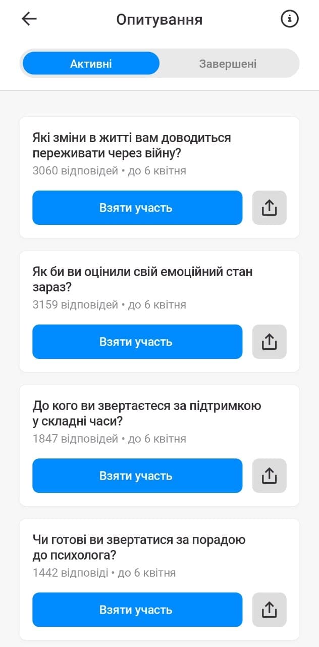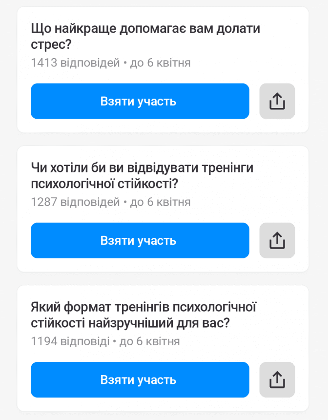 У «Київ Цифровий» кажуть, що результати опитування допоможуть розробити програми психологічної підтримки, а також визначити формати тренінгів психологічної стійкості, які найбільше підходять містянам.