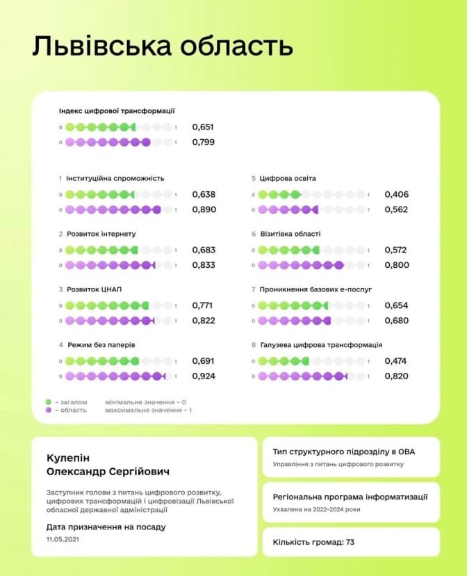 Львівщина – в п’ятірці лідерів за Індексом цифрової трансформації. Метою визначення індексу є створити базу для дослідження рівня цифрової трансформації в обласних адміністраціях. Про це повідомив заступник голови з питань цифрового розвитку, цифрових трансформацій і цифровізації Львівської ОВА Олександр Кулепін.