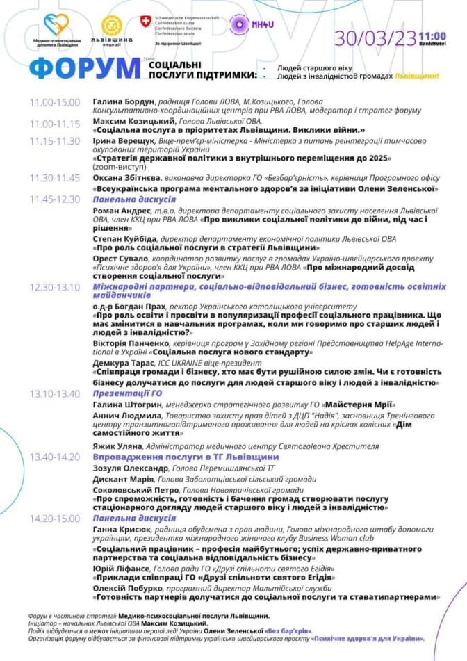 Форум пройде у цей четвер, 30 березня 11:00 – 15:00, і є частиною стратегії Медико-психосоціальної послуги Львівщини. Подія відбудеться за ініціативи першої леді України Олени Зеленської «Без бар’єрів». Організація – за фінансової підтримки українсько-швейцарського проєкту «Психічне здоров’я для України».