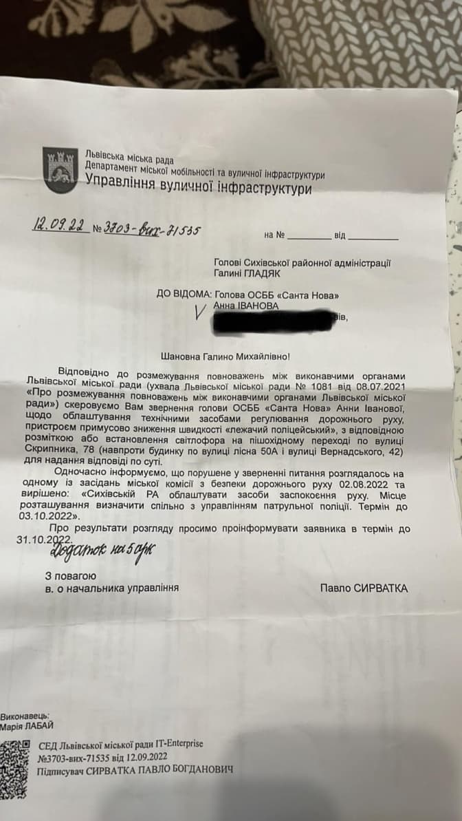 Львів’яни скаржаться на те, що Сихівська районна адміністрація ігнорує виконання рішення міської комісії з безпеки дорожнього руху, яке розглядала Львівська міська рада 2 липня 2022 року. Там вирішили, що Сихівська РА мусить облаштувати засоби заспокоєння руху по вул Скрипника, 78 до 3 жовтня 2022 року. Як повідомив у коментарі Tvoemisto.tv керівник відділу комунального господарства Сихівської РА ЛМР Іван Залуський, цього тижня планують почати роботи, оскільки є всі погодження, а закінчити – до Великодня.
