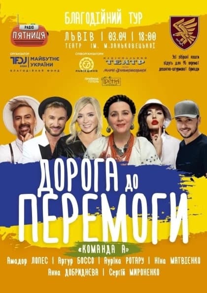 У приміщенні театру ім. Марії Заньковецької відбудеться концерт «Команди А» в межах благодійного туру «Дорога до Перемоги» за участю українських зірок: Ніна Матвієнко, Ауріка Ротару, Артур Боссо, Анна Добриднєва, Амадор Лопес та Сергій Мироненко. Усі зібрані кошти скерують на допомогу Збройним Силам України та 95 десантно-штурмовій бригаді.