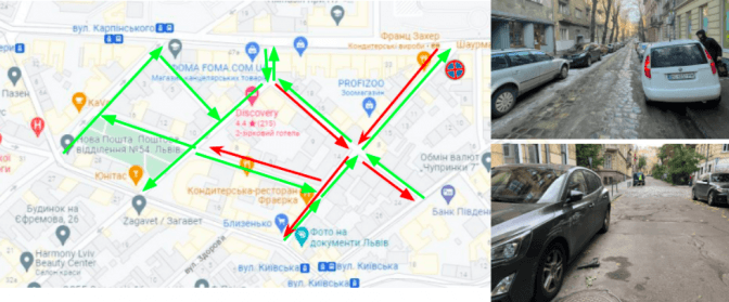 Так, зеленими стрічками на схемі позначені ті напрямки руху, які пропонують зберегти, а червоними – ті, які прибрати, влаштувавши в такий спосіб односторонній рух. За словами Павла Сирватки, попередній виїзд на локацію з мешканцями був ще минулого року, на місці були також представники патрульної поліції та Франківської районної адміністрації. Питання тоді відклали, бо була версія, що все-таки є можливість організувати паркування на цих вулицях, зберігши двосторонній рух. Натомість нині є відповідь поліції про те, що зробити неможливо.