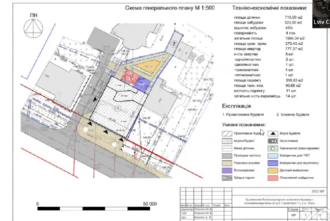 Йдеться про нове будівництво на земельній ділянці, яка знаходиться у приватній власності. Новий житловий будинок збудують на 4 поверхи. Загальна кількість квартир – 8, паркомісць – 14. Максимальний відсоток забудови становить 45%.