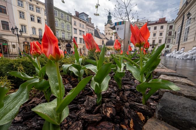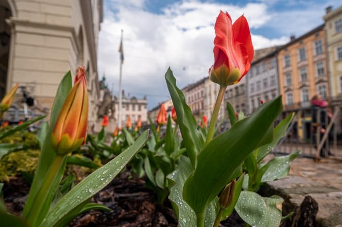У Львові зацвіли перші нідерландські тюльпани раннього сорту. Невдовзі розквітнуть і решта сортів. Мешканців просять не заходити на клумби, не витоптувати і не зривати квіти.
