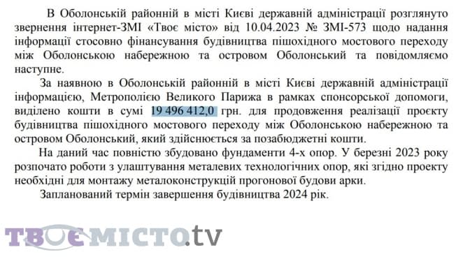 На будівництво пішохідного мосту-хвилі на Оболоні, довжиною 160 метрів, не залучають кошти з міського бюджету. «Метрополією Великого Парижа в рамках спонсорської допомоги, виділено кошти в сумі 19 496 412,0 грн. для продовження реалізації проєкту будівництва пішохідного мостового переходу між Оболонською набережною та островом Оболонський, який здійснюється за позабюджетні кошти», - йдеться в повідомленні.