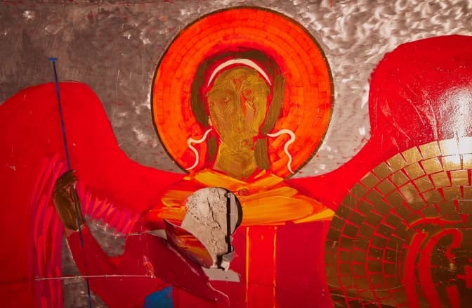 Але після початку повномасштабної війни село Липівка окупували російські варвари, які розстріляли церкву. Особливо постраждала баня, у якій вже змонтували архангелів, серафимів і пантократора. У архангелів повиривало груди, у серафимів відірвало крила, пантократора було посічено уламками. Художники вирішили залишити ці розписи в такому стані для нащадків – як приклад варварства загарбників.
