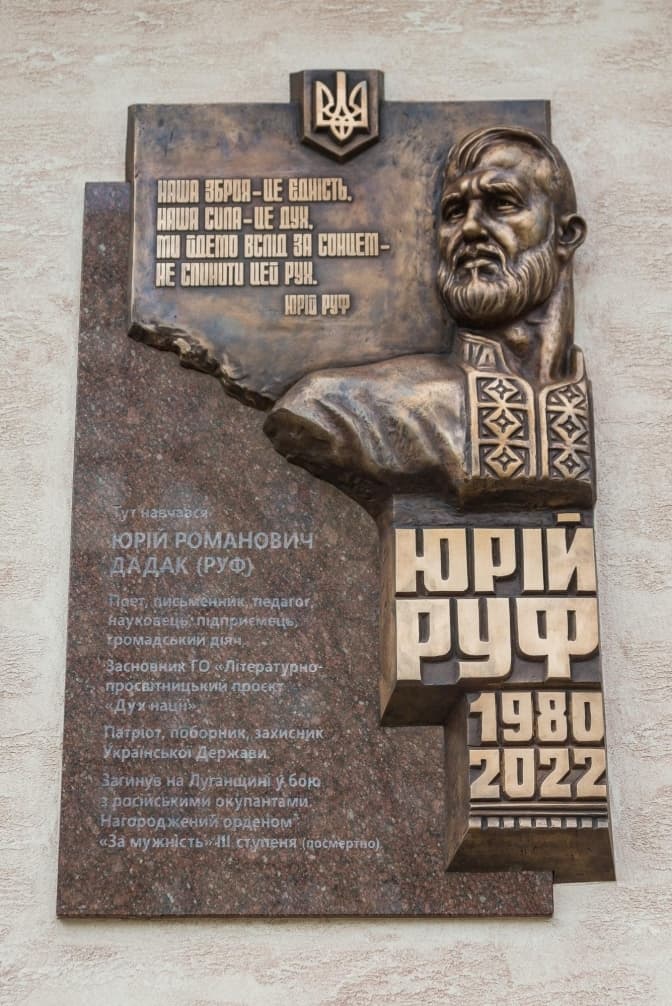 У середу, 19 квітня, у Львові відкрили меморіальну дошку, присвячену громадському діячу, поету, засновнику літературного проєкту «Дух Нації», воїну Юрію Дадаку (Руфу).