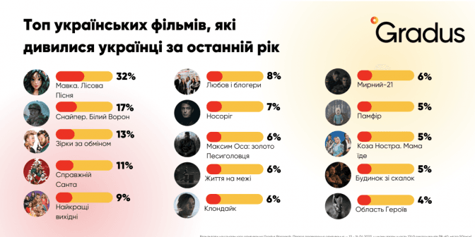 Під час повномасштабного вторгнення українці почали частіше дивитися українське кіно: 33% опитаних переглядають його регулярно. Про це свідчать результати опитування компанії Gradus Research у березні 2023.