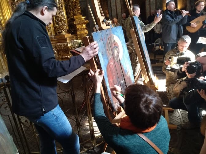 У КОВА зауважили, що під час відкриття виставки митці вписували імена загиблих бійців на тлі ікон циклу, як символічне твердження того, що пам’ять про них житиме вічно.
