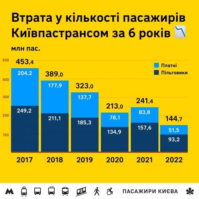 За 2022 рік «Київпастранс» перевіз 144,7 мільйона пасажирів, а за 2021 рік – 241,4 мільйона. Крім того, у 2022 році перевезли 93,2 мільйона пільговиків і 51,5 мільйона платних пасажирів. Щодо платних пасажирів, то їх вдалося зберегти завдяки тому, що тарифи на комунальний транспорт не підвищували в той час, як приватні перевізники підняли вартість проїзду до 12-15 гривень у травні 2022 року, вважають у «Пасажирах Києва».