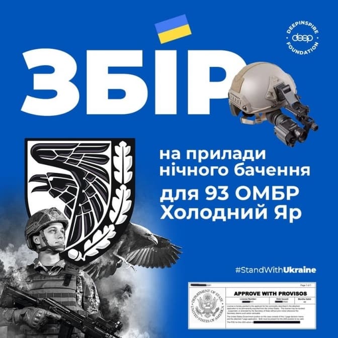 Команда волонтерів DeepInspire Foundation спільно з громадською організацією «Форпост» збирають на 90 приладів нічного бачення (PVS-14 Gen3) для 93 ОМБр «Холодний яр» та антидронову рушницю для 55 окремого стрілецького батальйону.