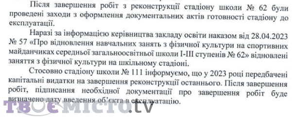 «Наразі за інформацією керівництва закладу освіти наказом від 28.04.2023 № 57 «Про відновлення навчальних занять з фізичної культури на спортивних майданчиках середньої загальноосвітньої школи I-III ступенів № 62» відновлені заняття з фізичної культури на шкільному стадіоні», – йдеться у відповіді.