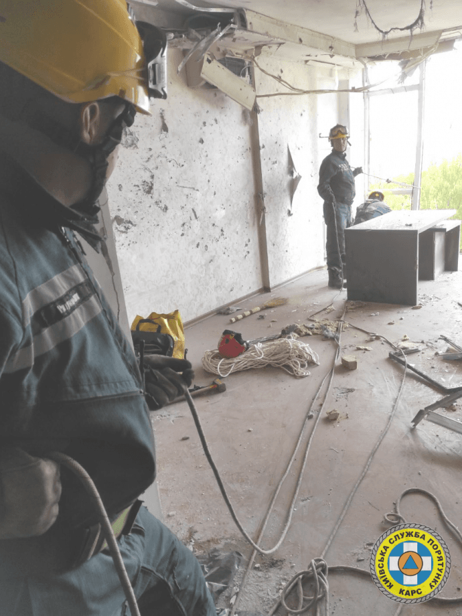 9 травня робота фахівців КАРС продовжиться — з допомогою спецтехніки планується демонтувати зруйновану ділянку фасаду будинку.