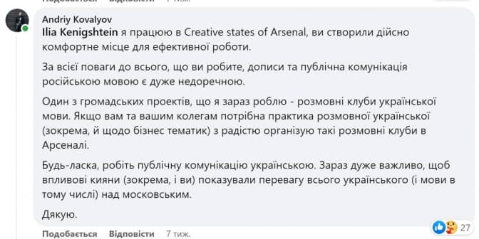 У Києві мовознавці спільно з Creative States, які створюють сучасні офіси-коворкінги, започаткували проєкт «Українська мова для бізнесу». Про це написав учасник робочої групи зі створення Концепції ствердження української мови в усіх сферах життя столиці у 2023-2025 Андрій Ковальов, який сам користується коворкінгом компанії на Арсенальній. Він запропонував впроваджувати та популяризувати українську мову у сфері бізнесу.