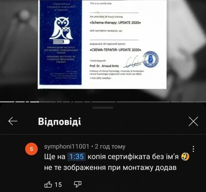Разом з тим у відповідному відео, психолог не розповів, де саме здобував вищу освіту, чи дійсно він навчався в медуніверситеті Богомольця, не спростував інформацію про стосунки з клієнтками, співробітництва з ОПЗЖ та роботу в ТОВ «СБУ».