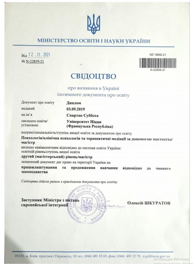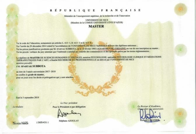 Зазначимо, 10 травня Спартак Суббота виклав відео щодо документів про свою освіту. Зокрема, він опублікував Свідоцтво про визнання в Україні його диплому магістра Університету Ніцци у Франції за напрямком «психологія/клінічна психологія та терапевтична медитація за допомогою мистецтва». Свідоцтво нібито видане Міністерством освіти і науки України і датоване 2021 роком.