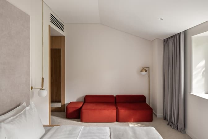 «Ми запропонували лаконічний дизайн, який задовольняє запити гостей та не дисонує з архітектурою будівлі. На прохання замовника, ми відмовились від чорних елементів в інтер'єрі. Запропонована колірна гама стримана, але не монохромна: світлі стіни слугують нейтральним тлом, а вкраплення теплих відтінків, як-от бордового та рудого, додають затишку. В інтер’єрі багато світла й елементів із дерева та латуні», – додали архітектори.