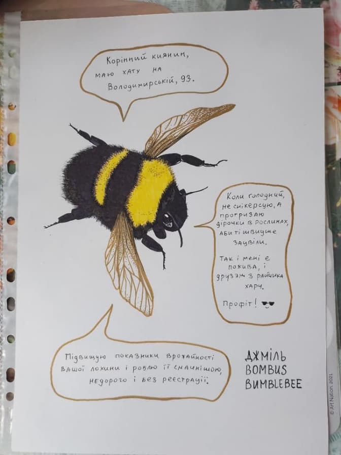 До «Будинку з комахами» на вул. Володимирській, 93 столичні активісти 14 травня повернули у вигляді інформаційного листка комаху-джмеля. Крім того, підасфальтували ями. Про це інформує активіст Дмитро Перов.