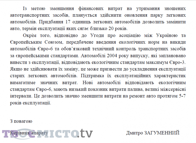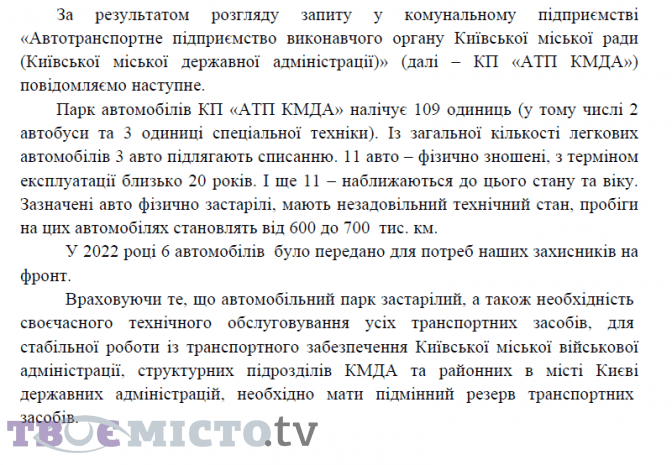 «Враховуючи те, що автомобільний парк застарілий, а також необхідність своєчасного технічного обслуговування усіх транспортних засобів, для стабільної роботи із транспортного забезпечення Київської міської військової адміністрації, структурних підрозділів КМДА та районних в місті Києві державних адміністрацій, необхідно мати підмінний резерв транспортних засобів», – додають в Автотранспортному підприємстві КМДА.