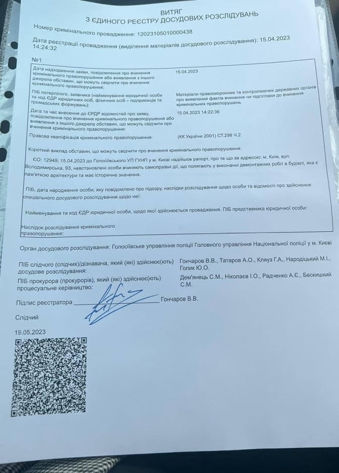 Національна поліція України відкрила кримінальне провадження за фактом умисного пошкодження або руйнування об’єктів культурної спадщини щодо незаконного руйнування пам’ятки архітектури – Будинку Марії Станіславської (1893 р.), що на вул. Володимирській, 93. Про це повідомив активіст та співзасновник пам'яткоохоронного хабу «Цегла» Дмитро Перов.