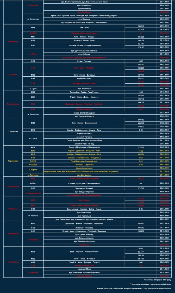 Відомо, що з урахуванням воєнного стану та результатів проведеного аналізу аварійності, до 327 ділянок внесені наступні зміни: додано 28 нових ділянок, внесено зміни до 27 ділянок, видалено з переліку 41 ділянку, призупинено роботу на 54 ділянках.