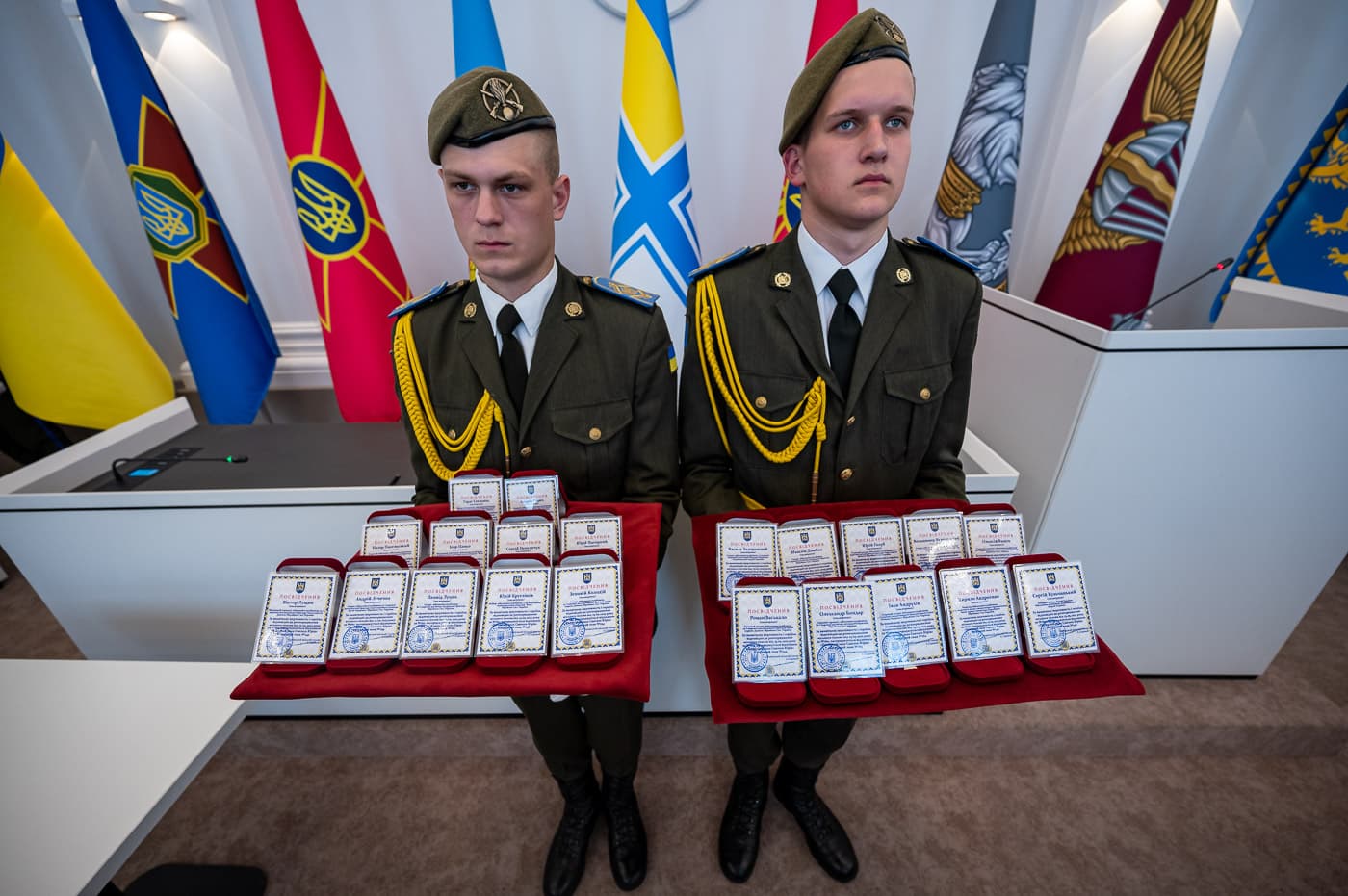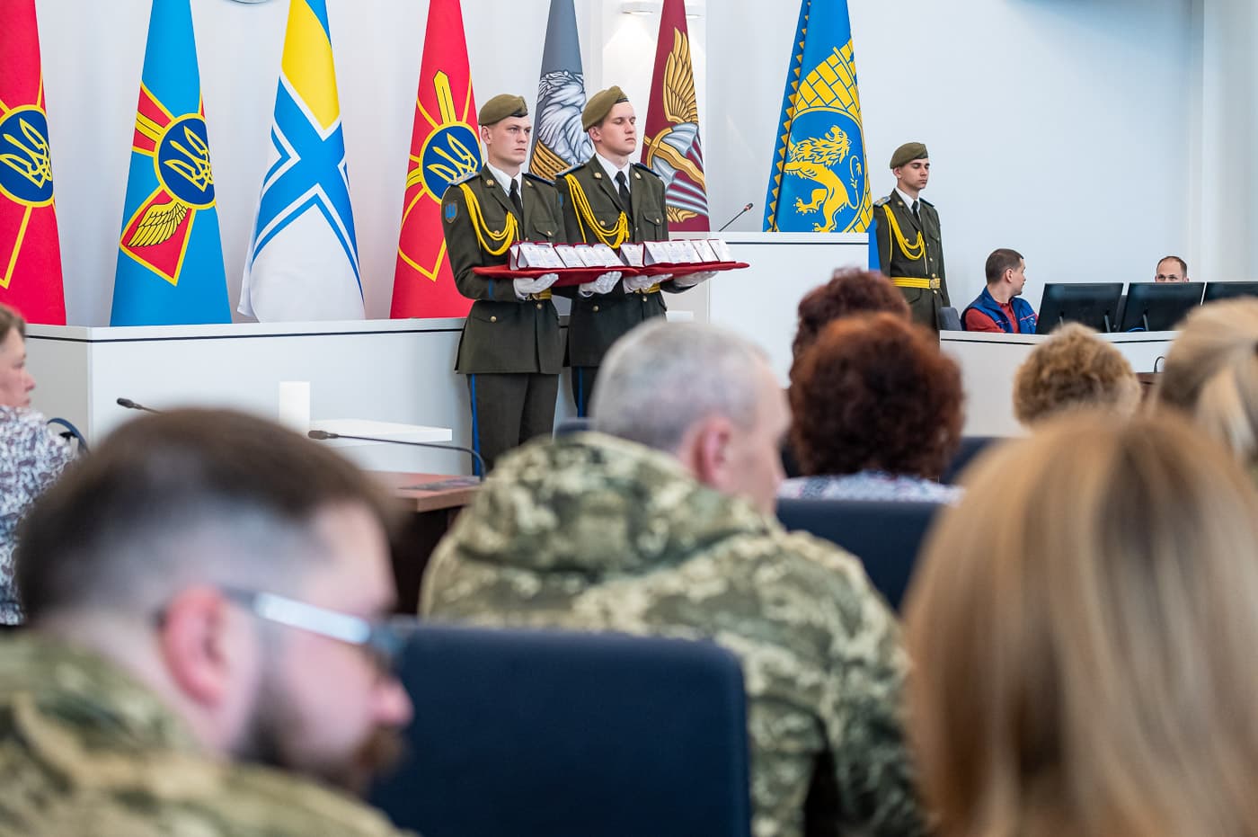 У залі розставили прапори усіх видів Збройних Сил України. Також запалили свічку як символ вічної пам’яті про Героїв. Музичний супровід на заході забезпечував Муніципальний хор «Гомін», а почесна варта несла службу.