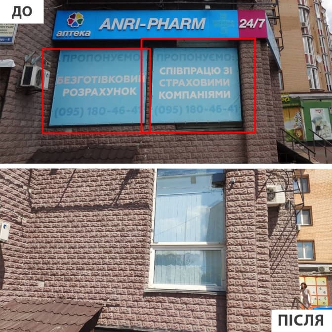 Комунальники розказали, що часто зустрічають таку ситуацію, коли підприємці повністю закривають рекламними плитами вхідну частину фасаду. За шаром вивісок і реклами ховаються вікна, елементи декору або елементи інженерної інфраструктури.