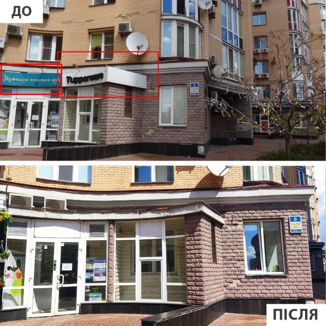 «Наші демонтажники, як археологи, проводили розкопки, щоб дістатися до колись закритої частини фасаду. Звичайно, таке розміщення є незаконним. У місті діють вимоги до вивісок і реклами, які не допускають перекриття вікон, інженерних комунікацій і декоративних елементів. Заборонено розміщувати конструкції на другому поверсі будівлі, а також на балконах», - розказали в «Київрекламі».