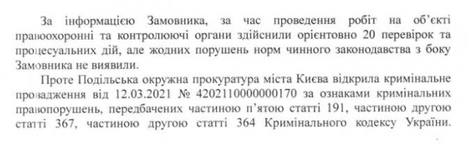 За результатами аналізу вилучених у результаті обшуків документів правоохоронці попередньо виявили факти суттєвого завищення вартості залучених послуг та матеріалів, а також обсягів проведених робіт.
