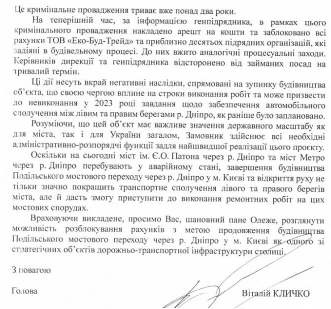 Кличко наголошує на важливості для столиці будівництва Подільського мосту (триває з 1993 року –ред.) і просить розблокувати рахунки.