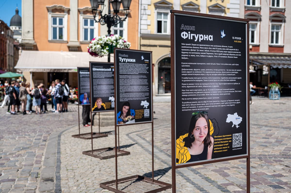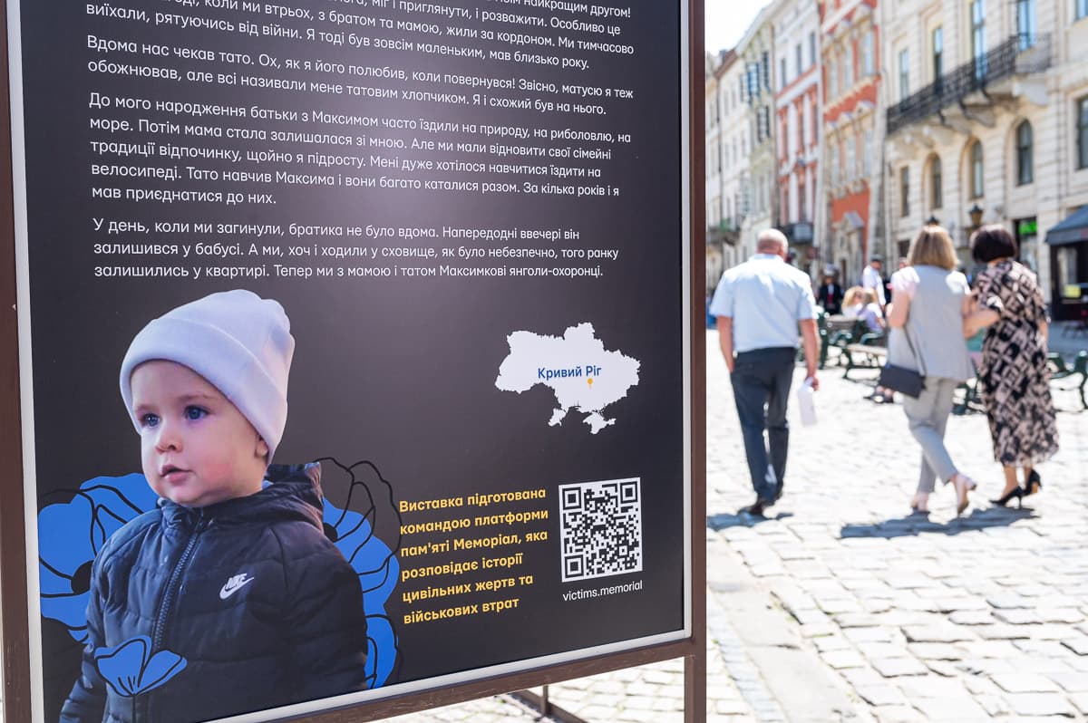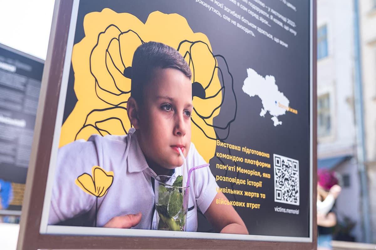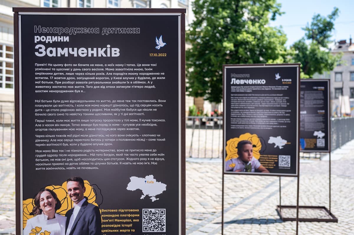 «Ще вчора, готуючись до виставки, ми знали, що загинуло 483 дитини, а вже сьогодні зранку дізнаємось, що від ракетного обстрілу померла ще одна. На цій виставці представлені 13 історій загиблих дітей, які ми підготували спільно з їх рідними. Ці історії зроблені так, ніби їх розповідають діти, щоб привернути увагу до величезної трагедії нашої нації, щоб зберегти пам'ять про тих, чиє життя відібрали так рано», – розповіла Юлія Лозинська, редакторка платформи пам'яті Меморіал.