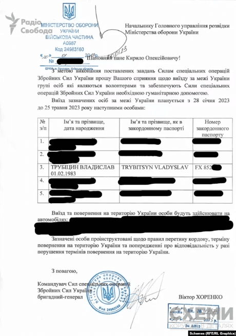 Схеми отримали від своїх джерел в оборонних структурах копію клопотання ССО до ГУР. У документі зазначено, що період виїзду п’яти людей, серед яких Трубіцин, — із 28 січня до 25 травня.