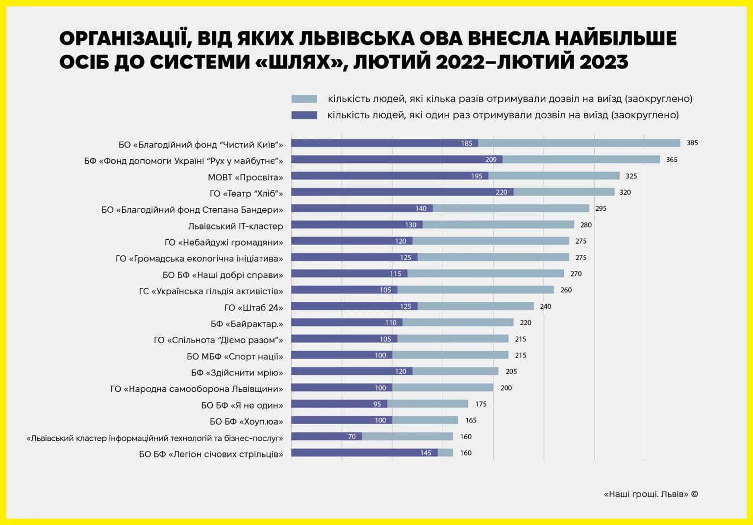 Однак очолив список «найуспішніших» заявників до Львівської ОВА благодійний фонд «Чистий Київ» (385 людей), який називають одним із головних партнерів ЛОВА з питань гуманітарного допомоги. Ця організація була створена ще в 2020 році, а в кінці березня 2022 з’явилась сторінка у Facebook, але там досі лише кілька дописів, датованих 26 березня 2022 року, зазначають «Наші гроші. Львів».