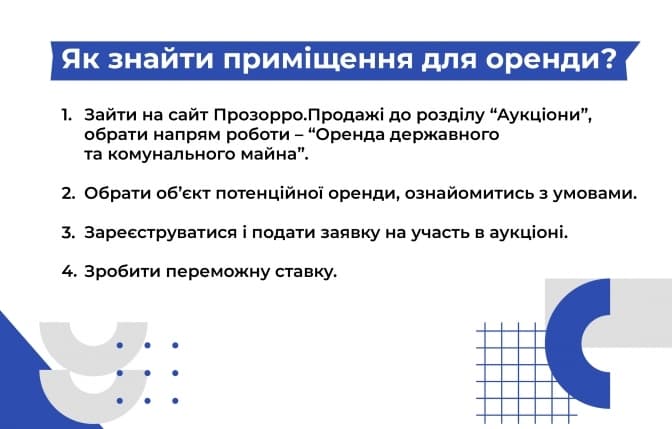 Державна електронна торгова система Прозорро.Продажі – це своєрідна вітрина, де держава та органи місцевої влади виставляють свої об’єкти, а бізнес може вибрати щось відповідно до потреб. Детальніше переваги такої оренди: