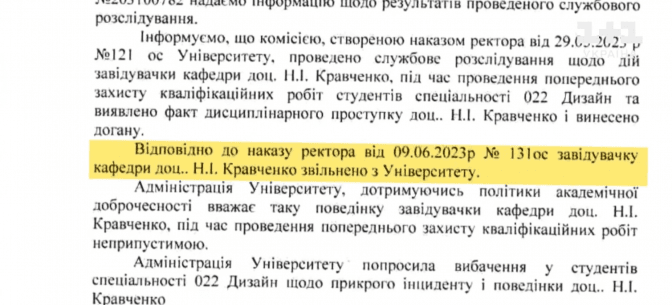 Відповідно до наказу від 09.06.2023 р. №131ос, «завідувачку кафедри доц.. Н.І. Кравченко звільнено з Університету. Адміністрація Університету, дотримуючись політики академічної доброчесності вважає таку поведінку завідувачки кафедри доц. Н.І. Кравченко під час проведення попереднього захисту кваліфікаційних робіт неприпустимою».
