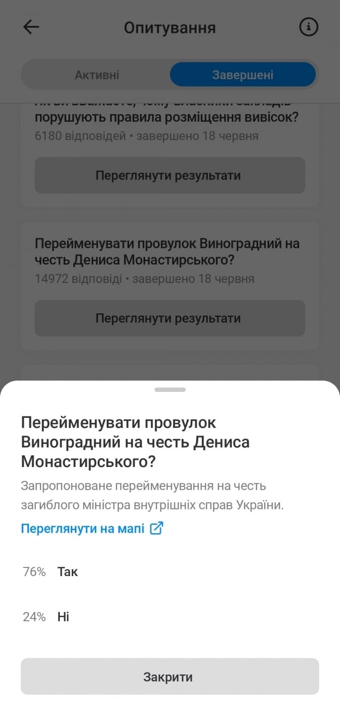 Нагадаємо, у застосунку «Київ Цифровий» 18 червня завершилися опитування щодо перейменування ще 3 топонімів міста.