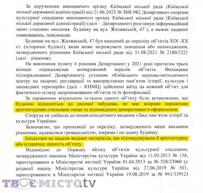 «У 2021 році протягом трьох місяців Департамент опрацьовував затверджений перелік об’єктів. Фахівцями підпорядкованої Департаменту установи «Київського науково-методичного центру по охороні, реставрації та використанню пам’яток історії, культури і заповідних територій» (далі – КНМЦ) здійснено виїзд на кожний об’єкт для фактичного огляду запропонованих об’єктів та їх фотофіксацїї. За первинним візуальним оглядом даного об’єкту було встановлено, що будинок відноситься до рядової забудови, не має яскраво виражених архітектурних стильових ознак та відповідного декоративного оформлення», – йдеться у листі.