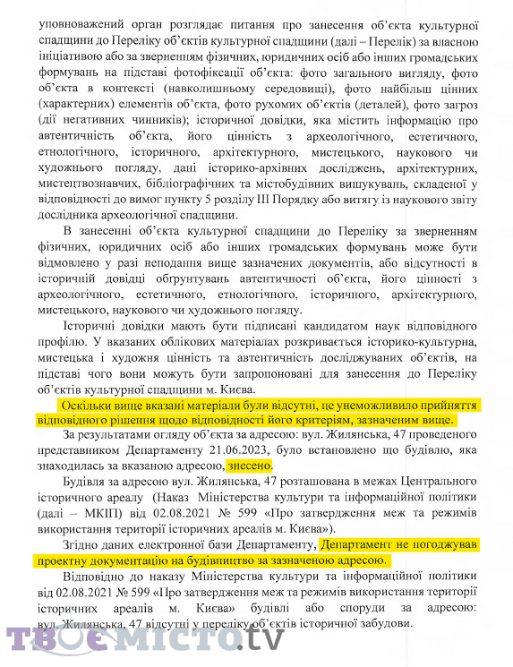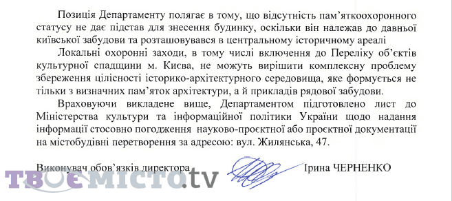 Як зазначають у Департаменті, з ними не погоджували проєктну документацію на будівництво за зазначеною адресою, тому КМДА підготувало лист до Міністерства культури та інформаційної політики України щодо надання інформації стосовно погодження науково-проєктної або проєктної документації на містобудівні перетворення за адресою: вул. Жилянська, 47.