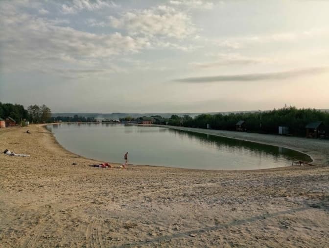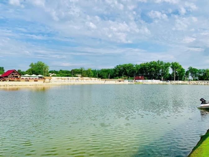 Ця база відпочинку розташована не так близько, як інші. Але тут можна не тільки поплавати у великому озері, а й скористатись послугами готелю і бару.