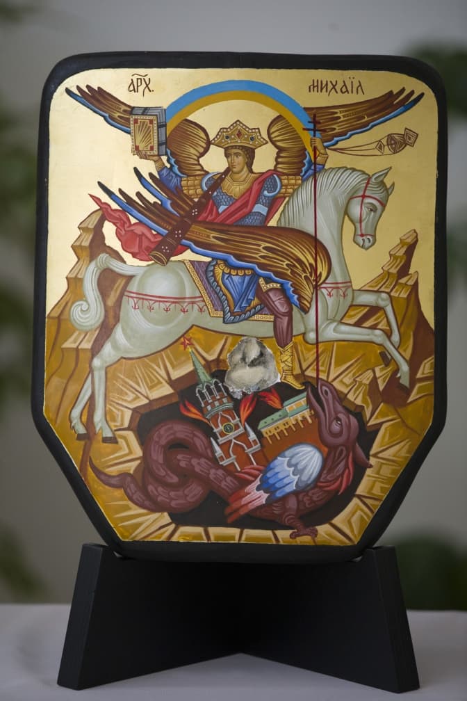 Зазначимо, такі ікони, написані на пошкоджених від ворожих куль бронеплитах, Президент України Володимир Зеленський подарував Папі Франциску, а також Президентам Польщі та Литви.