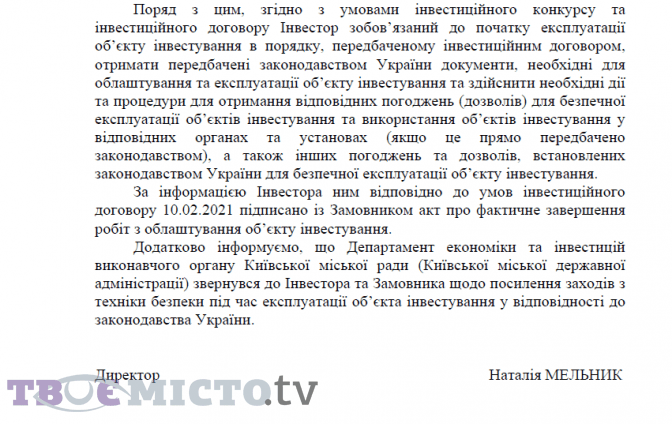 Також в Департаменті зазначили, що саме інвестор «зобов'язаний до початку експлуатації об'єкта інвестування в порядку, передбаченому інвестиційним договором, отримати передбачені законодавством України документи, необхідні для облаштування та експлуатації об'єкта інвестування та здійснити необхідні дії та процедури для отримання відповідних погоджень (дозволів) для безпечної експлуатації об'єктів».