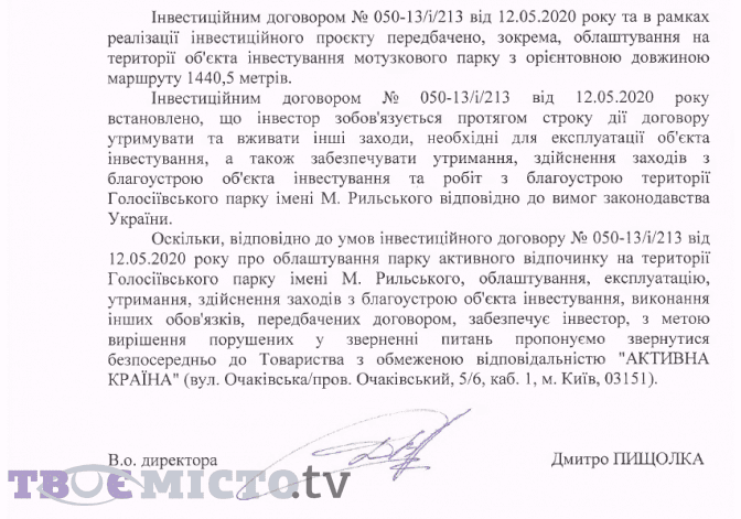 У комунальному підприємстві по утриманню зелених насаджень Голосіївського району м. Києва, яке є замовником проєкту «Мотузкового парку», вказали на особисті зобов'язання інвестор, який «протягом строку дії договору повинен утримувати та вживати інші заходи, необхідні для експлуатації об'єкта інвестування».