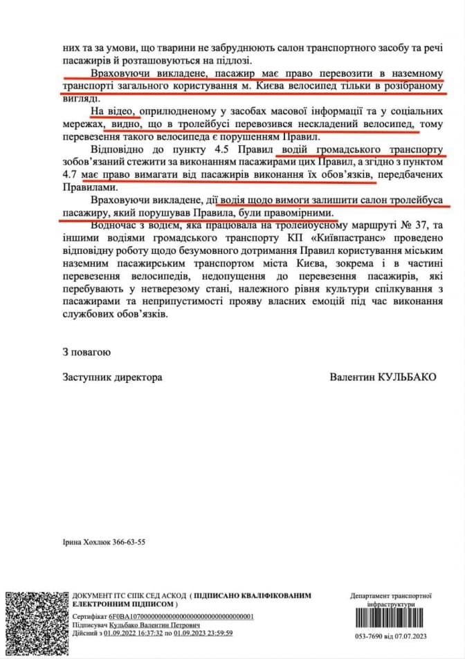 У відповіді йдеться, що у тролейбусі перевозився нескладений велосипед і це є порушенням правил. Тому водійка мала право вимагати від пасажири їх дотримуватися – її вимога була правомірною.