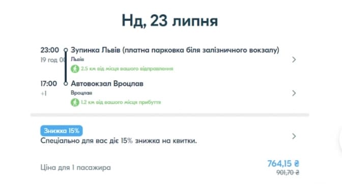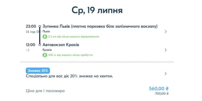 Для отримання знижки у вебверсії сайту потрібно ввести в пошук бажаний маршрут із міст Львівської області. Знижка вказана біля вартості квитків.