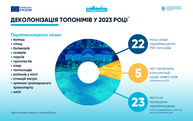 За перші пів року 2023 року 22 міські ради в Україні перейменували 959 топонімів. У п’яти містах (Миколаїв, Херсон, Черкаси, Чернівці, Коломия) тривають консультації із громадськістю щодо перейменування – планують змінити назви для щонайменше 205 топонімів.